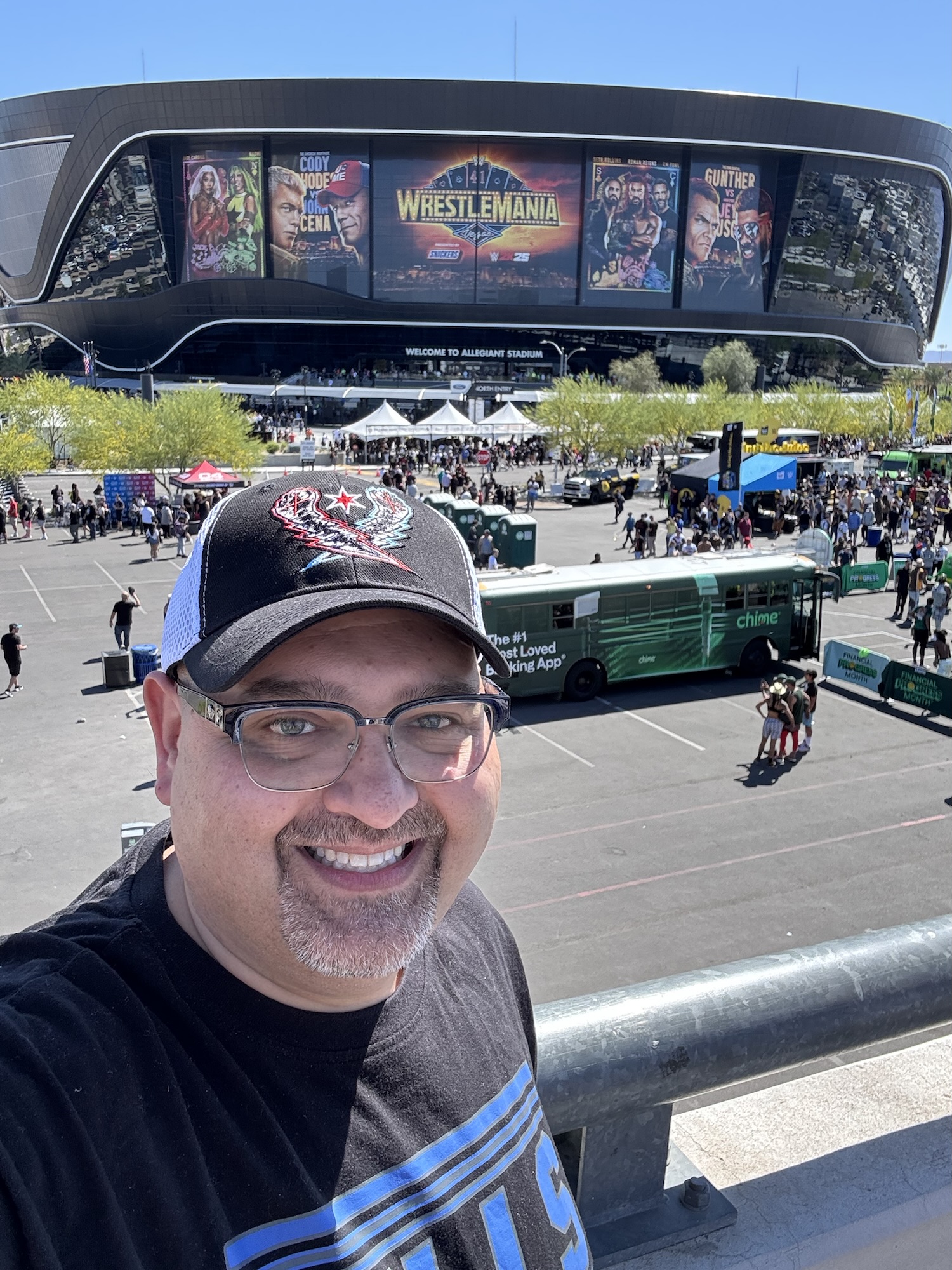 Then, I saw it. Allegiant Stadium. The black-and-sliver spaceship. WrestleMania banners hanging proudly on “The Death Start.”